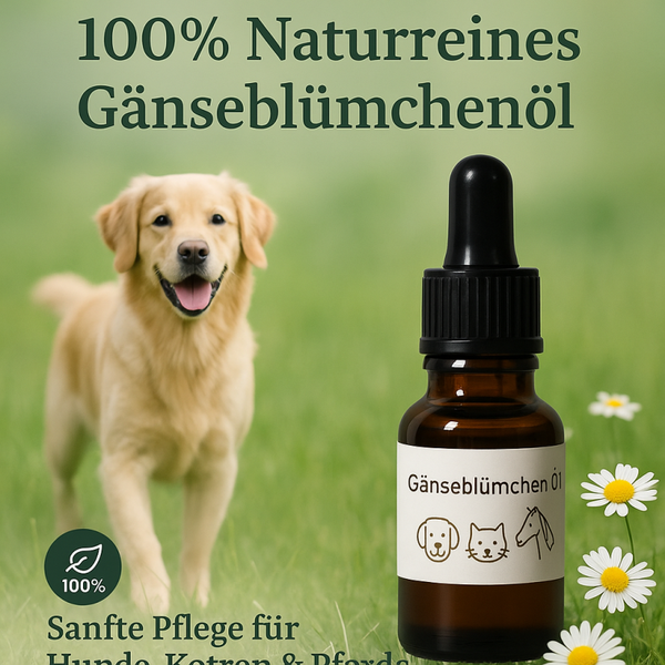 Entdecke die sanfte Kraft der Natur: Mein 100 % naturreines Gänseblümchenöl wird schonend aus handverlesenen Gänseblümchen hergestellt und eignet sich ideal zur natürlichen Haut- und Fellpflege bei Tieren.